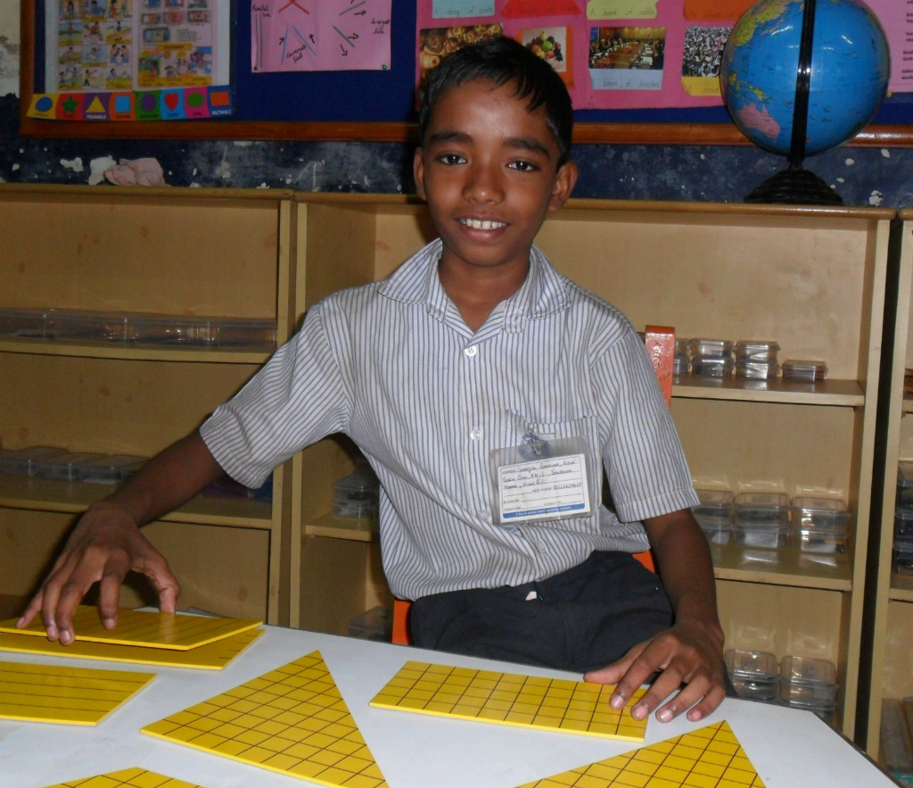 Alfiya can communicate well in English. However, her shyness prevents her from responding promptly. She can read simple phonetic books and has made a small booklet on ‘lines and circles’. She has good handwriting. With the help of the Montessori apparatus, Alfiya can perform addition, subtraction and multiplication up to four digits and understands formation of numbers. She has also learnt shapes of objects as well as days of the week and month.